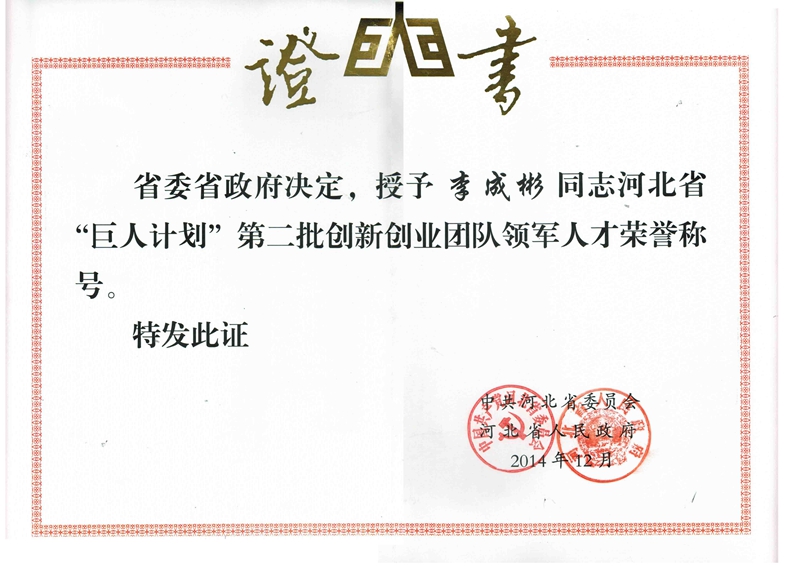 光源太陽能董事長李成彬,被授予河北省“巨人計劃”第二批創(chuàng)新創(chuàng)業(yè)團隊領軍人才榮譽證書