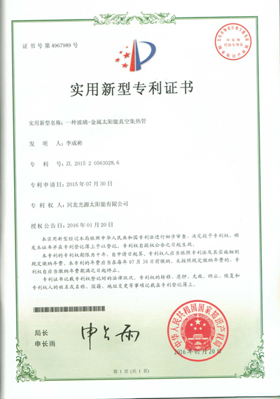 實用新型專利證書--一種玻璃-金屬太陽能真空集熱管