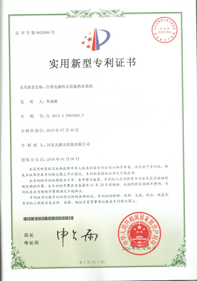 實用新型專利證書--自帶電源的太陽能熱水系統(tǒng)