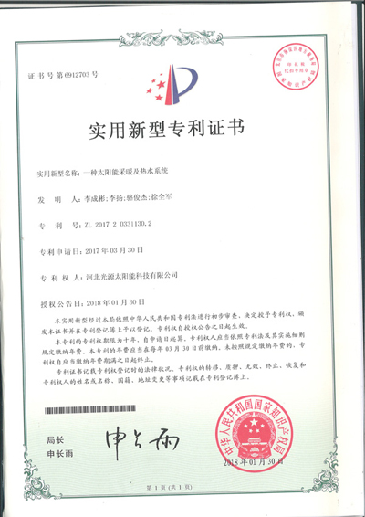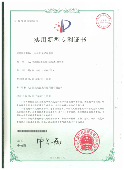 實用新型專利證書--一種太陽能采暖系統(tǒng)