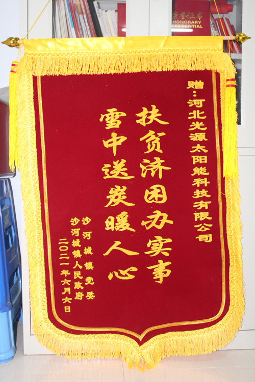 送人鮮花 留有余香 今天光源送給農(nóng)民壁掛爐,鎮(zhèn)黨委政府送來(lái)錦旗。錦旗上褒揚(yáng)光源的14個(gè)大字就是余香:“扶貧濟(jì)困辦實(shí)事,雪中送碳暖人心”。這余香是鼓勵(lì)也是激勵(lì),是褒揚(yáng)也有希望。它鼓勵(lì)光源人要多做雪中送碳的人,激勵(lì)光源人多做扶貧濟(jì)困的事兒。光源人不會(huì)辜負(fù)這面錦旗。