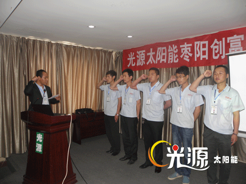 會(huì)議中湖北區(qū)域經(jīng)理劉進(jìn)輝帶領(lǐng)團(tuán)隊(duì)進(jìn)行的宣誓儀式,充分展現(xiàn)了光源太陽(yáng)能有限公司的員工風(fēng)貌及企業(yè)精神。利用新能源,保護(hù)美好家園,傳承正能量,將會(huì)議推進(jìn)高潮。