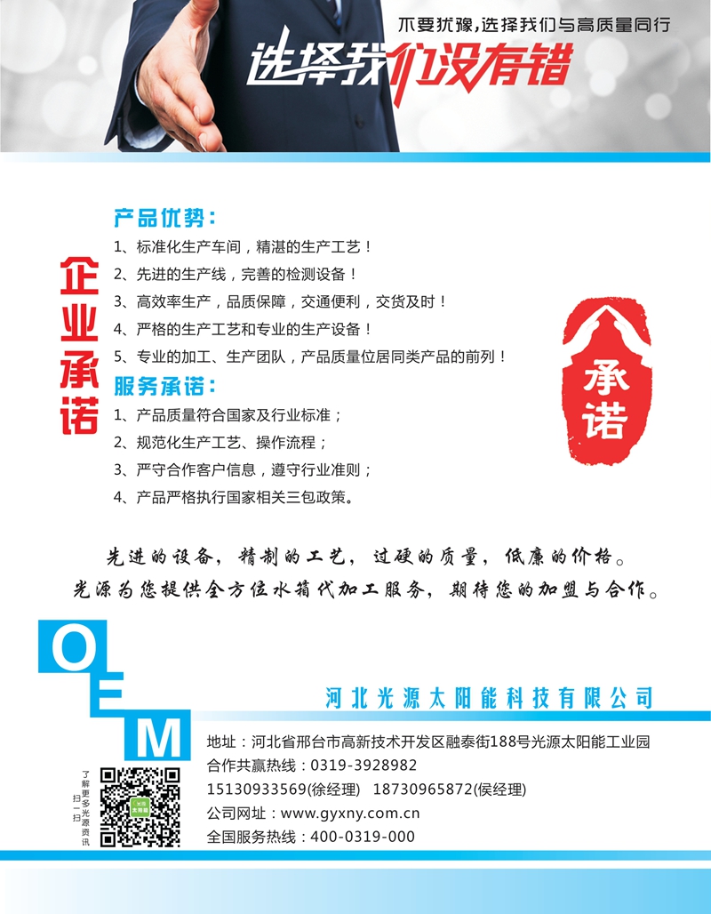 河北光源太陽能科技有限公司是一家集太陽能光熱產(chǎn)品研發(fā)、生產(chǎn)、銷售為一體的專業(yè)化骨干企業(yè)。公司地址位于河北省邢臺經(jīng)濟開發(fā)區(qū),總占地150畝,建筑面積5.2萬平方米,現(xiàn)有員工420人。主導(dǎo)產(chǎn)品:一是太陽能真空集熱管;二是家用型太陽能熱水器;三是集中式中高溫太陽能工程的設(shè)計、生產(chǎn)與施工。企業(yè)規(guī)模為河北省太陽能熱利用行業(yè)榜首,國內(nèi)業(yè)界名列前茅。