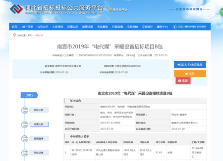7月23日我公司(河北光源太陽能科技有限公司)在南宮市2019年“電代煤”采暖設(shè)備招標項目的競標中,憑借過硬的產(chǎn)品質(zhì)量,扎實高效的工作作風,卓越的運作團隊和良好的企業(yè)信譽,以絕對的優(yōu)勢順利中標。