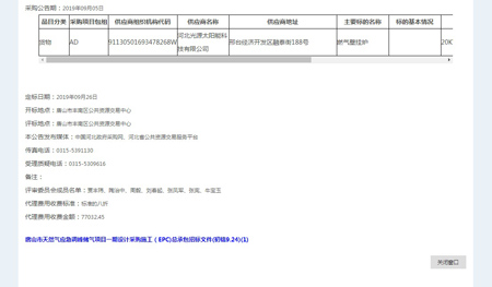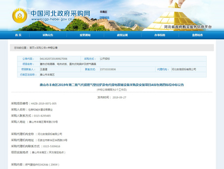 奮力拼搏創(chuàng)佳績(jī),捷報(bào)頻傳奏凱歌。河北光源太陽(yáng)能科技有限公司,在2019年09月27日,唐山市豐南區(qū)2019年第二批氣代煤燃?xì)獗趻鞝t及電代煤電取暖設(shè)備采購(gòu)及安裝項(xiàng)目A標(biāo)包第四標(biāo)段中標(biāo),為我公司2019年度輝煌的經(jīng)營(yíng)業(yè)績(jī)?cè)偬頋饽夭实囊还P。