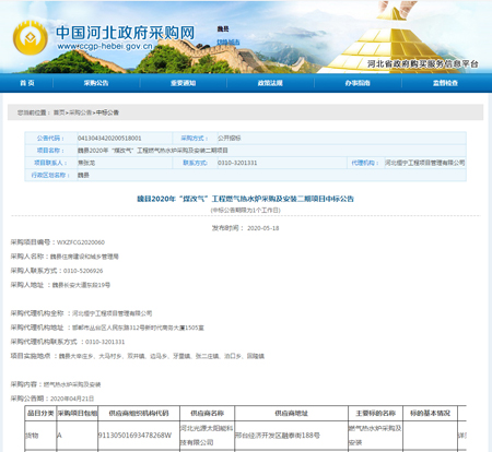 魏縣2020年“煤改氣”工程燃?xì)鉄崴疇t采購及安裝二期項目